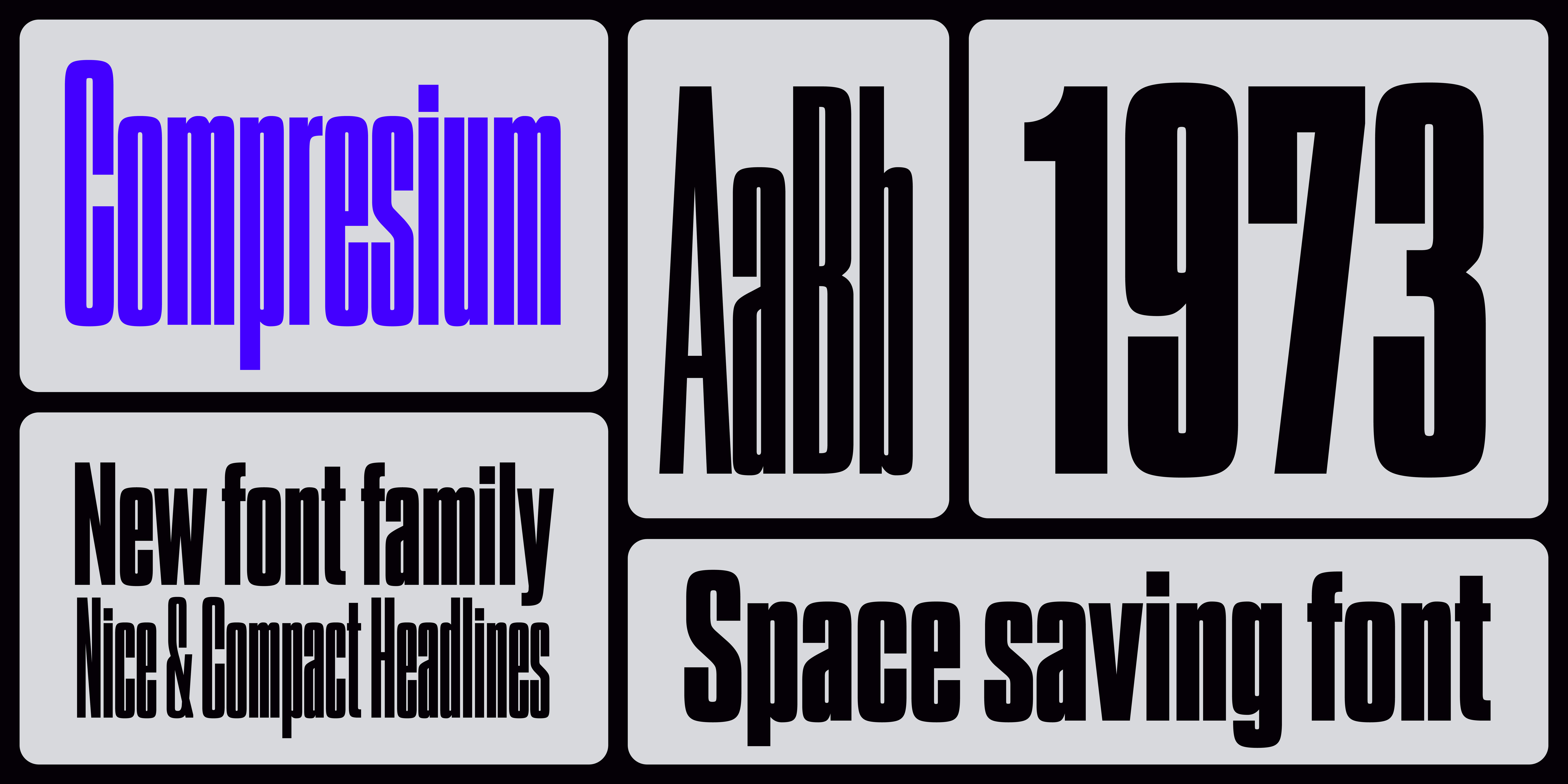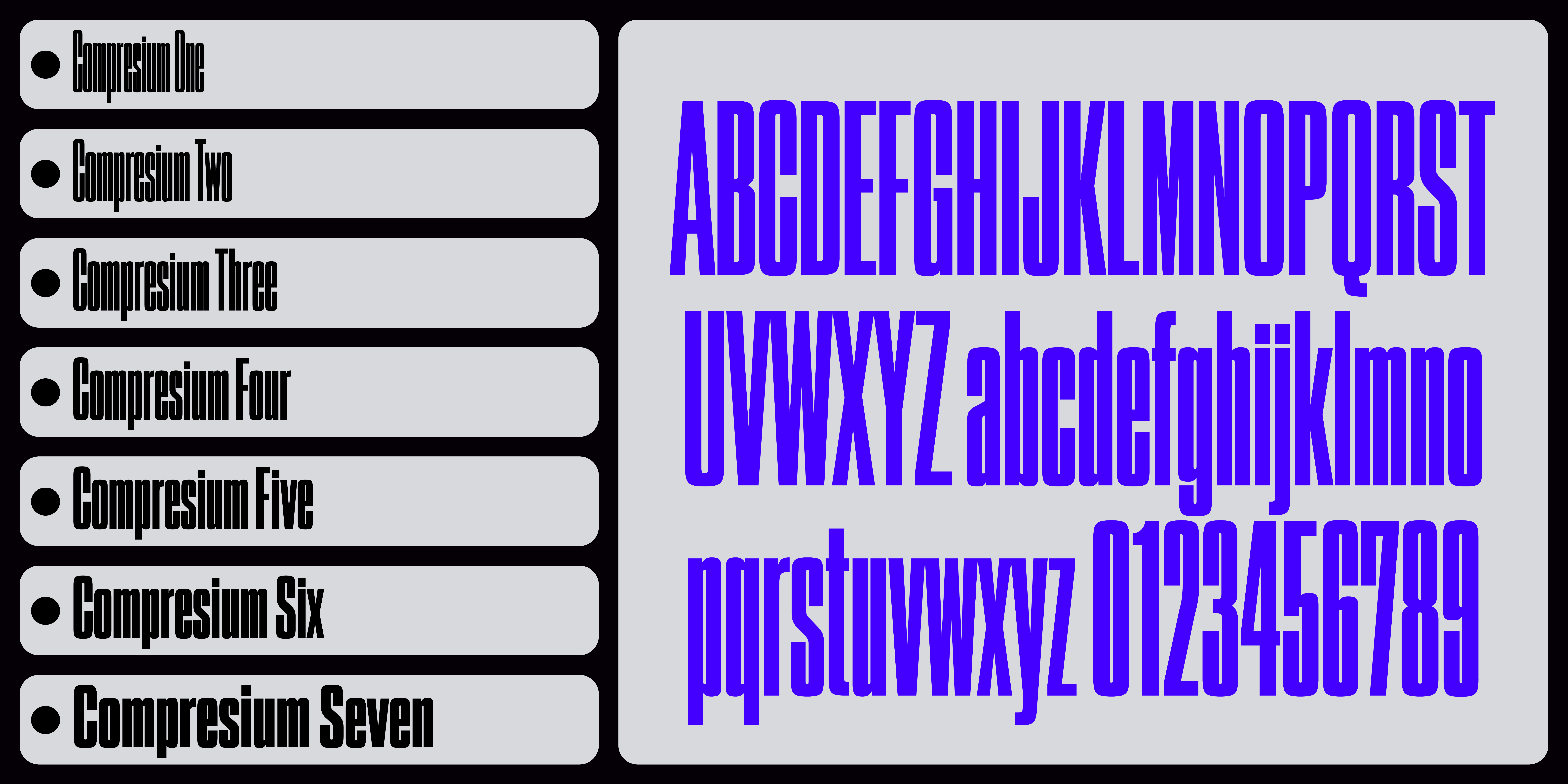 Compresium evolved from the family’s most most distinctive weight, the Seven. This style was first scaled vertically and then rescaled to match its original height, making it significantly more condensed. Its squared curves reinforce the compact rhythm by tightening the white space. As its name suggests, Compresium embodies this transformation: a series of seven ultra-condensed and powerful styles created to make a strong visual impact.