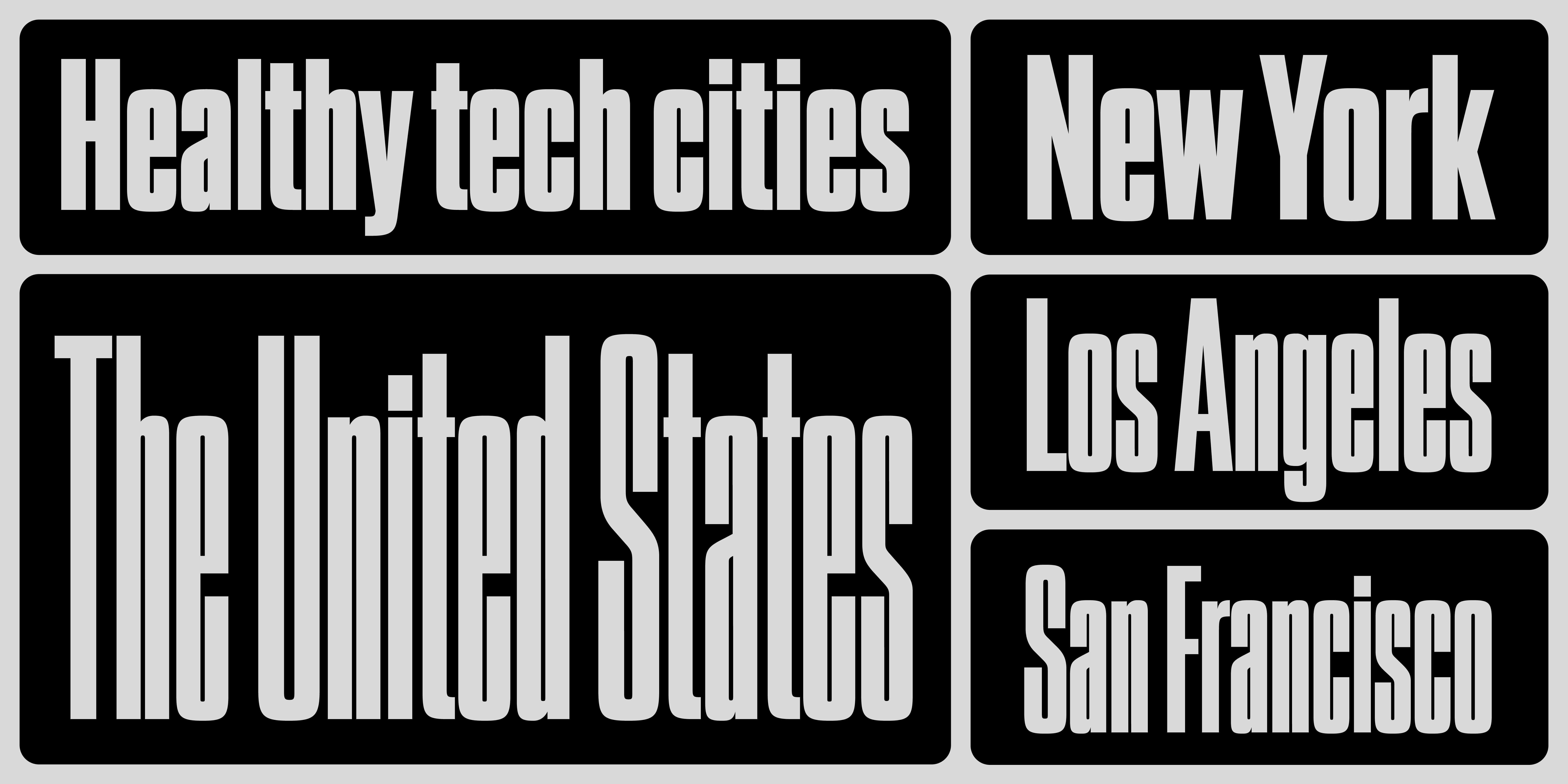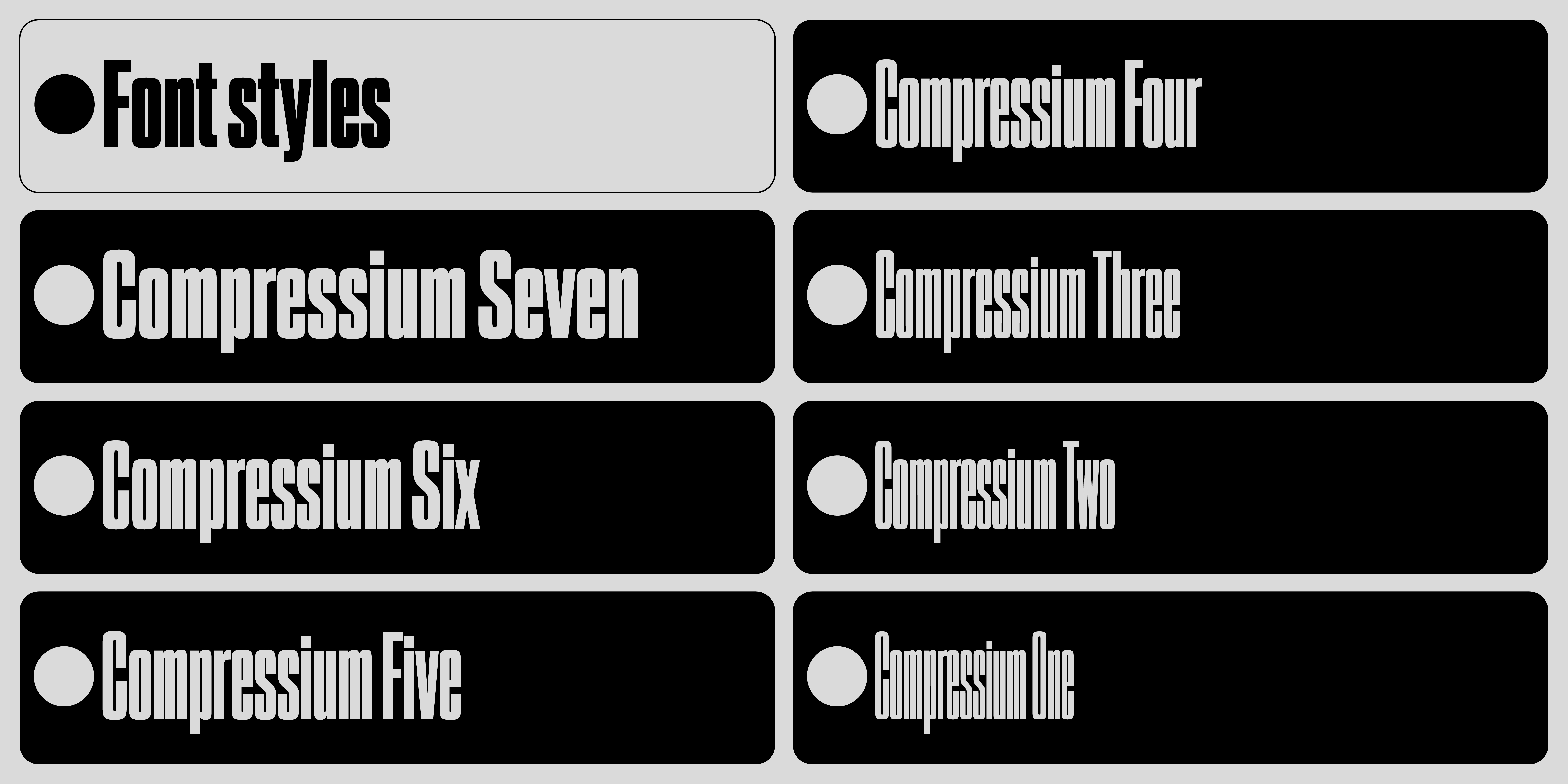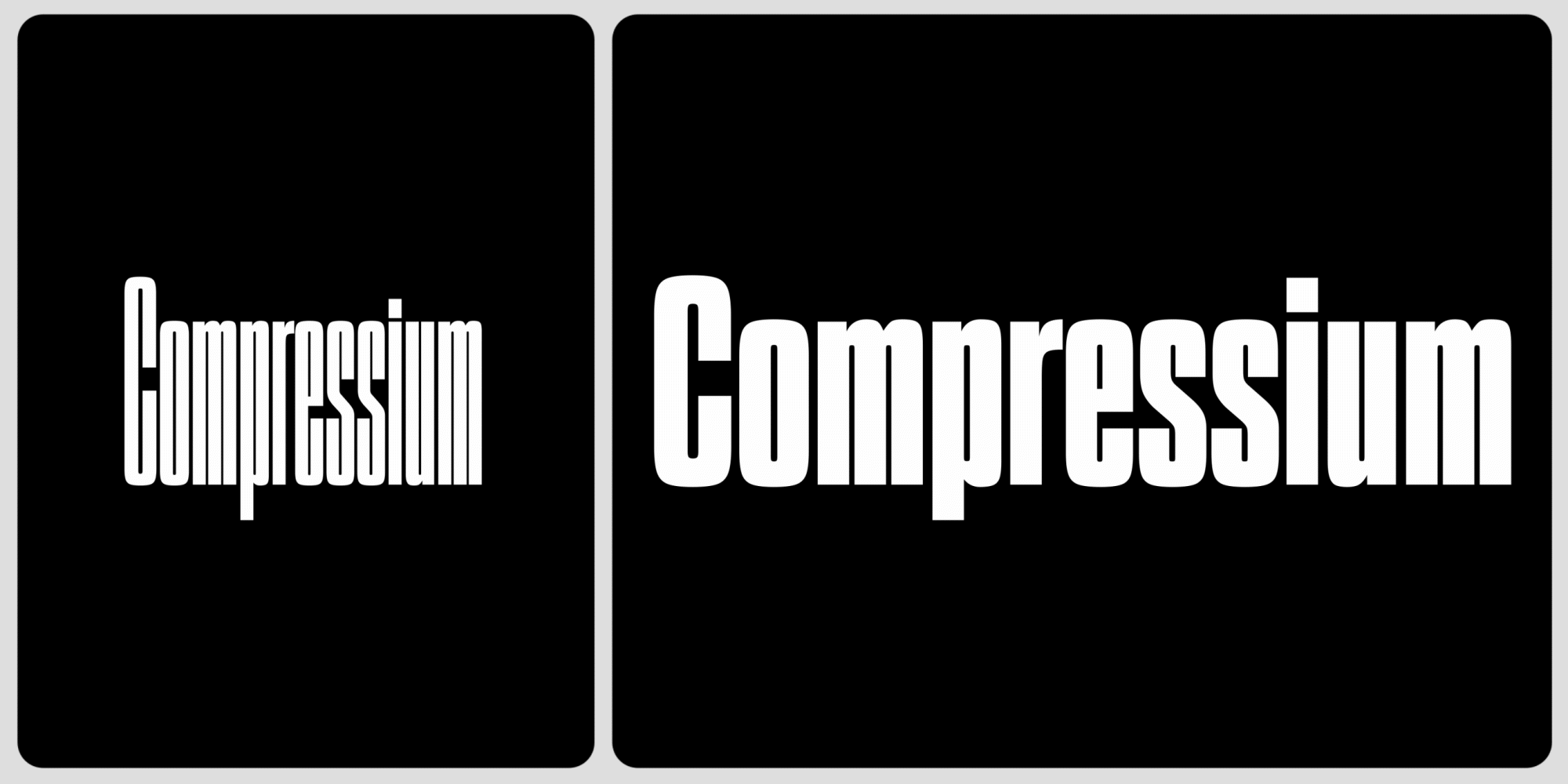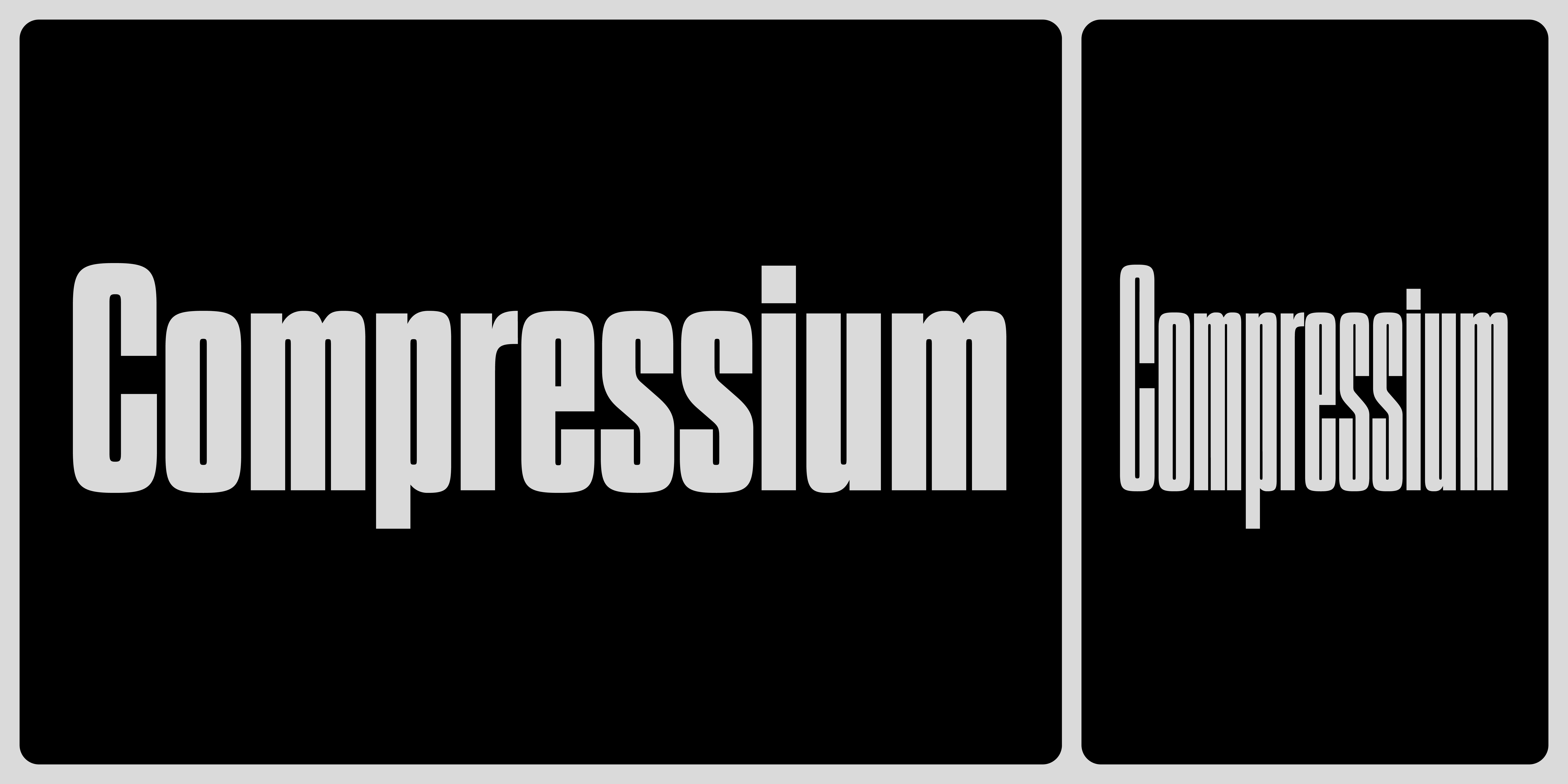 Compressium evolved from the family’s most distinctive weight, the Seven. This style was first scaled vertically and then rescaled to match its original height, making it more condensed. Its squared curves reinforce the compact rhythm by tightening the white space. As its name suggests, Compressium embodies this transformation: a series of seven ultra-condensed and powerful styles created to make a strong visual impact. Special launch price!